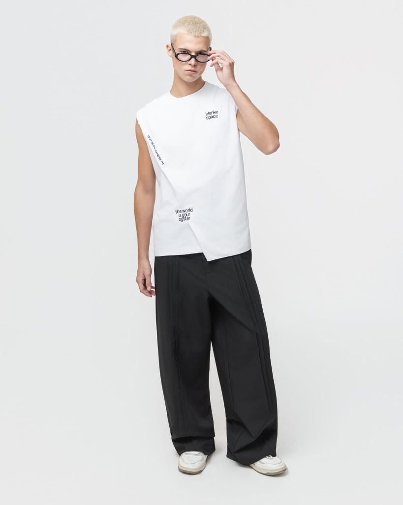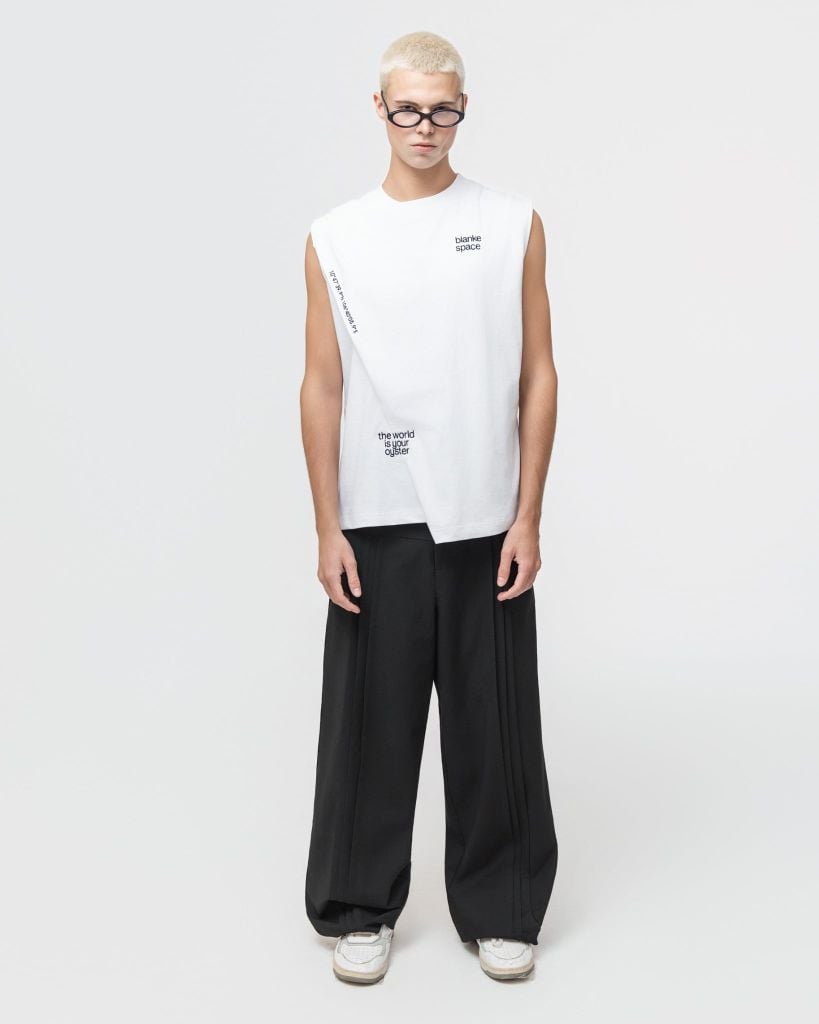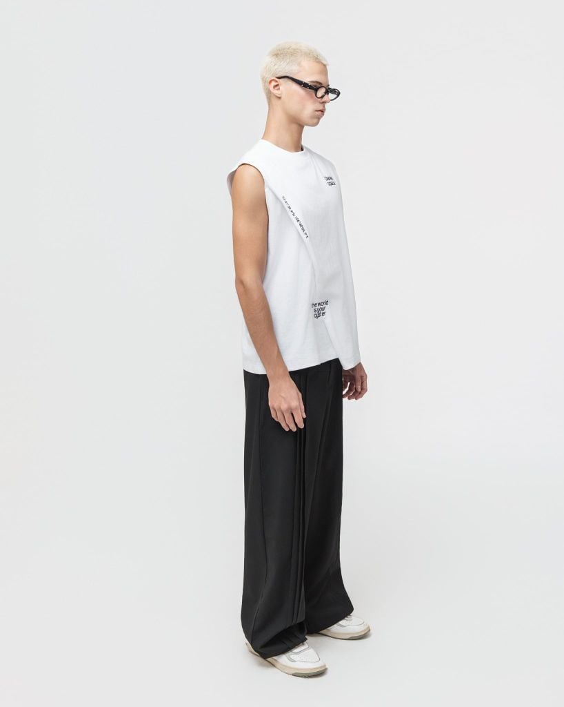 ▪️ Thiết kế: Áo tanktop dáng suông hiện đại, sát nách gọn gàng. Điểm nhấn là đường cắt chéo bất đối xứng phía trước cùng chi tiết in chữ nhỏ tinh tế, tạo cảm giác tối giản nhưng vẫn mang tinh thần thời trang đương đại. Dễ phối cùng quần suông, shorts hoặc layer với jacket.