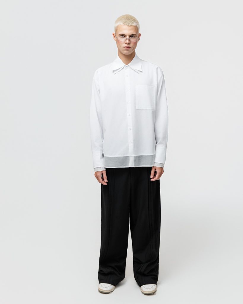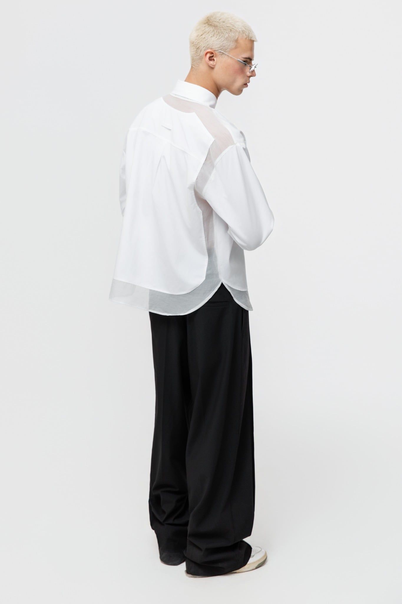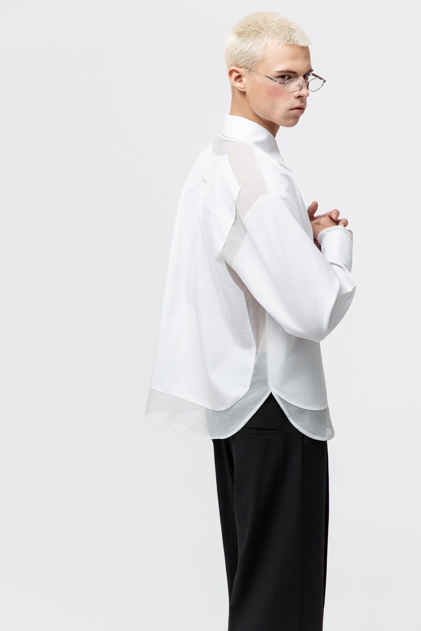 THANATOS SHIRT - Thông tin sản phẩm▪️ Chất liệu: Chất Liệu Kate Oxford Phối Organza▪️ Màu sắc: Màu trắng/Đen▪️ Thiết kế: Thiết kế tối giản tập trung vào cấu trúc cổ bản nhọn thanh thoát, hàng nút gọn gàng và túi ngực vuông tạo điểm nhấn, phối Organza tạo hiệu...
